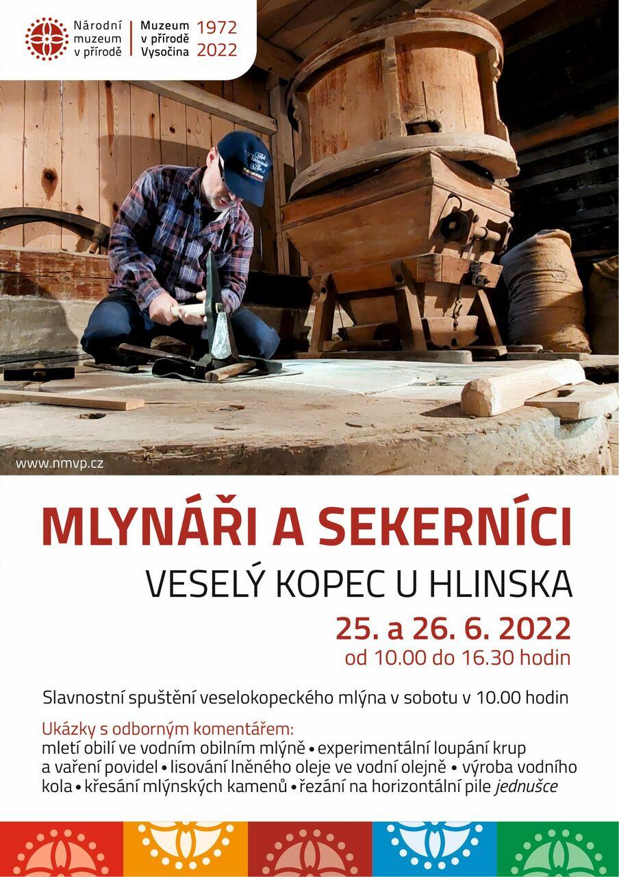 O víkendu 25. a 26. června 2022 se na Veselém Kopci u Svobodných Hamrů uskuteční program Mlynáři a sekerníci, jehož součástí bude slavnostní spuštění vodního obilního mlýna. Ten se spustí v sobotu v 10:00 hodin. Celovíkendový program probíhá od 10:00 do 16:30 hodin.