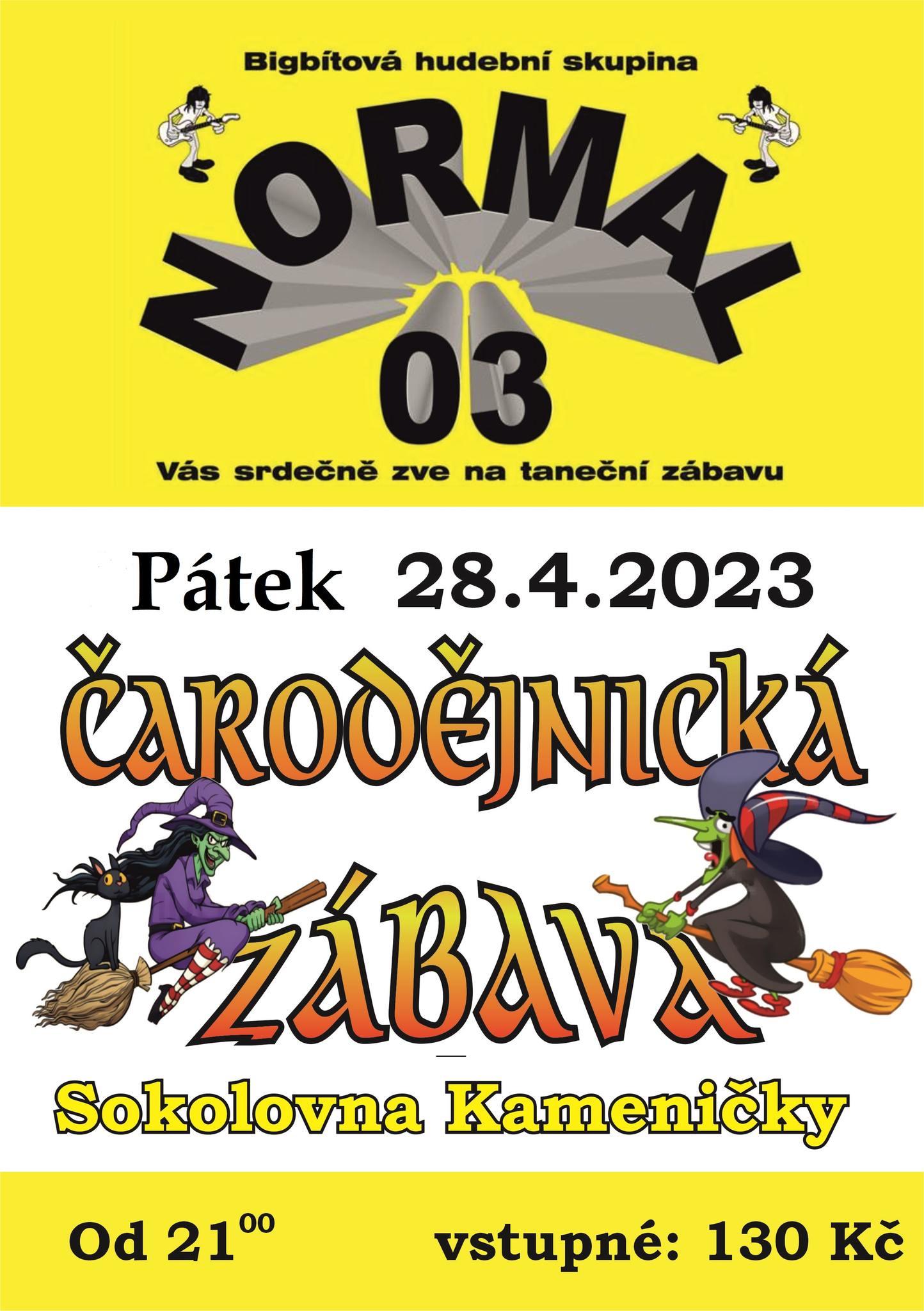 Již tradičně se v pátek před filipojakubskou nocí sejdeme v Kameničkách na Čarodějnické zábavě. Rej začíná ve 21 hodin a k tanci a poslechu nám zahraje bigbítová skupina Normal 03.