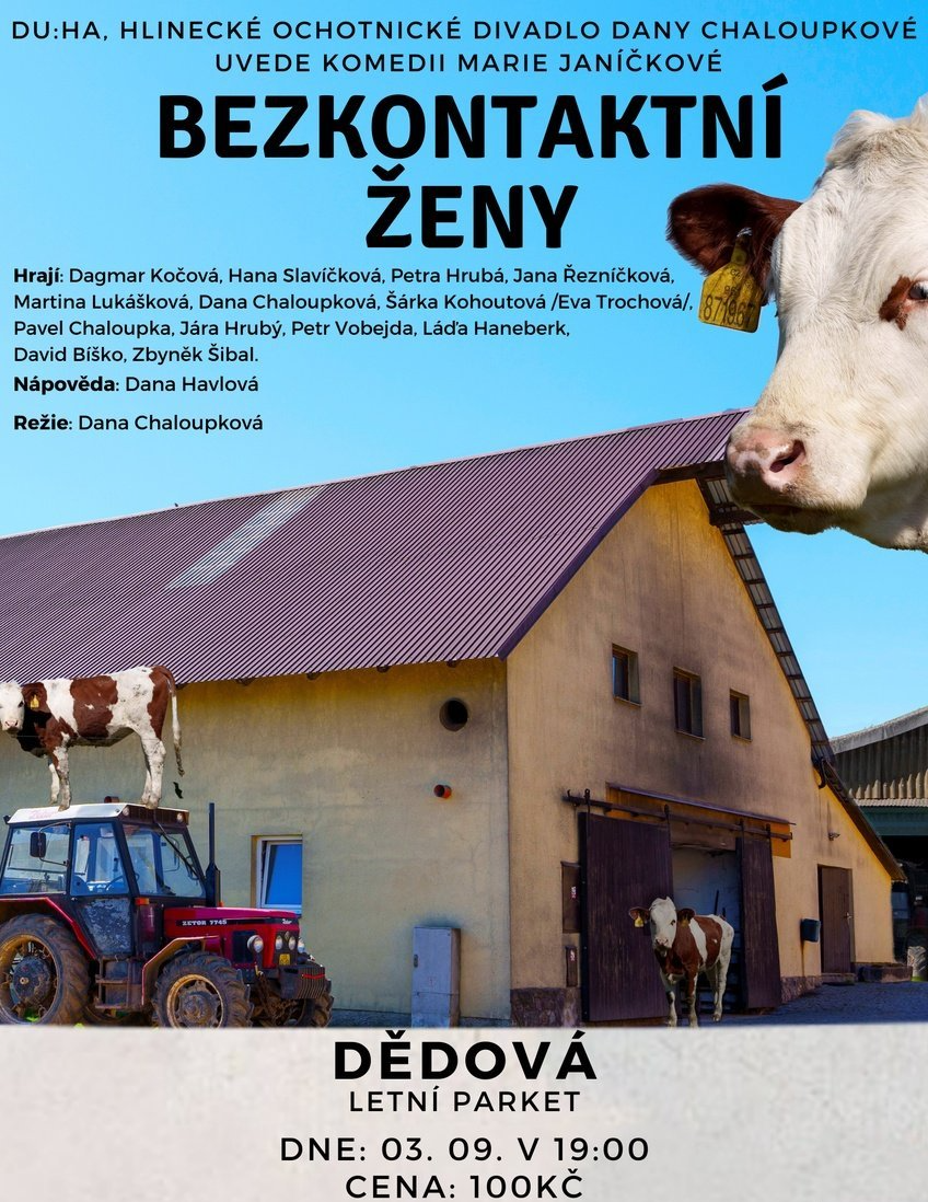 Sbor dobrovolných hasičů Dědová již nyní zve návštěvníky na zářijové divadelní představení hlineckého ochotnického divadla Dany Chaloupkové. Divadelní spolek DU:HA Hlinsko uvede komedii Marie Jeníčkové BEZKONTAKTNÍ ŽENY aneb AGROSTORY.