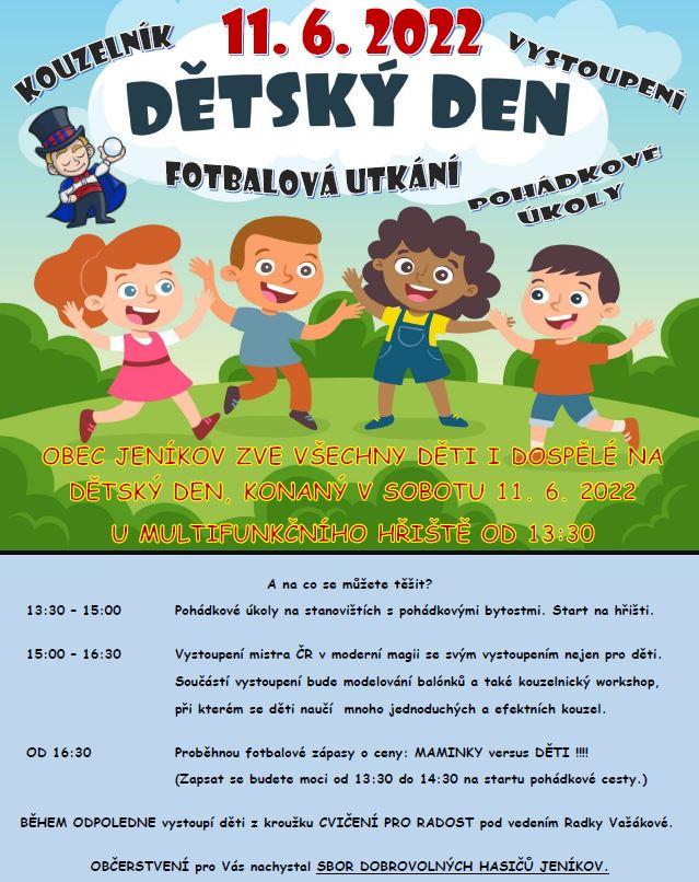 Dětský den v obci Jeníkov se uskuteční v sobotu 11. června od 13:30 hodin. Pozvání platí pro všechny děti i dospělé, zábavná akce se koná u multifunkčního hřiště v obci. Program bude velice bohatý.