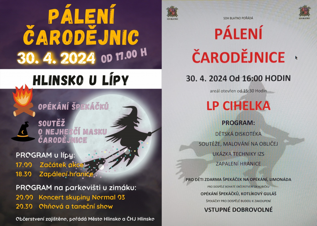 Pálení čarodějnic Hlinsko u Lípy a u zimního stadionu v Olšinkách: Začátek od 17:00 hodin u Lípy nad Hlinskem. Hranice bude zapálena v 18:30 hodin, dále bude probíhat opékání špekáčků a soutěž o nejhezčí masku čarodějnice. Od 20:00 hodin bude program pokračovat u zimního stadionu, kde bude mít koncert skupina Normal 03 a od 20:30 si návštěvníci mohou užít ohňovou a taneční show. Občerstvení je zajištěno.