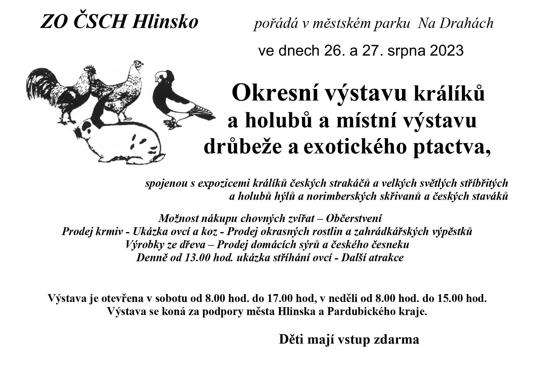 V sobotu bude výstava otevřena od 8:00 do 17:00 hodin a v neděli od 8:00 do 15:00 hodin. Výstavu pořádá Základní organizace chovatelů Hlinsko za podpory města Hlinska a Pardubického kraje. Děti mají vstup zdarma a výstava se koná za každého počasí. V případě deště bude možnost posezení v hale a krytém stanu.