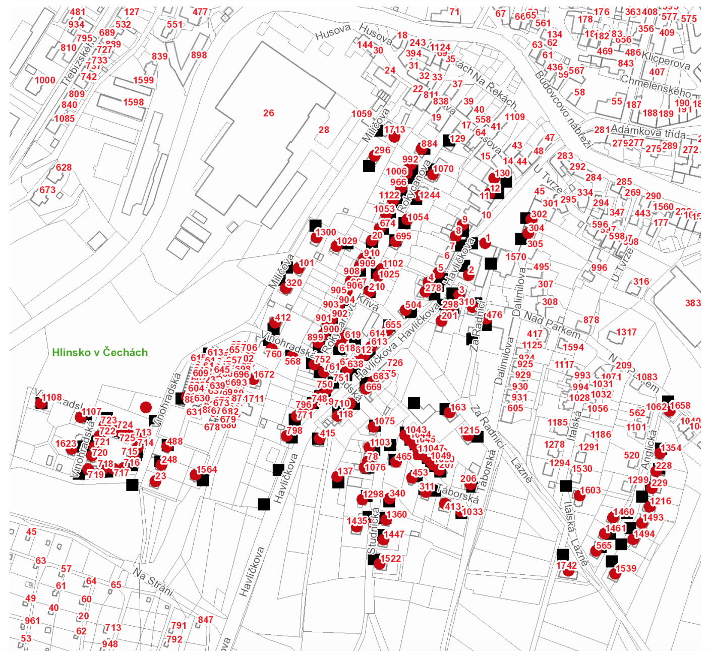 Havlíčkova: č. p. 2, 3, 4, 5, 8, 9, 118, 137, 201, 278, 298, 415, 504, 612, 613, 638, 639, 669, 683, 710, 748, 749, 750, 771, 796, 798