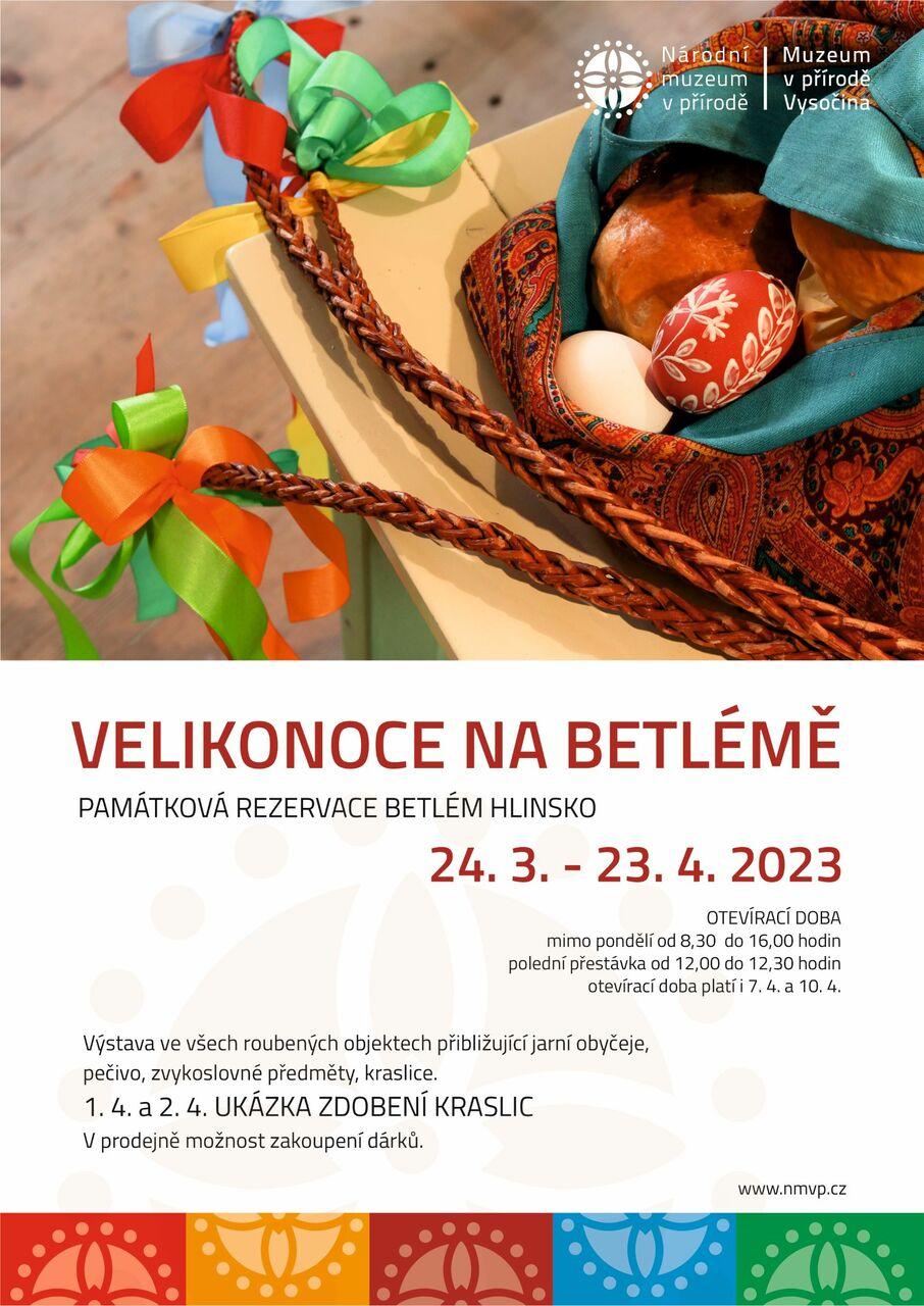V pátek 24. března 2023 začíná velikonoční výstava Velikonoce na Betlémě. Ta bude k vidění ve všech roubených objektech památkové rezervace Betlém Hlinsko až do 23. dubna 2023.