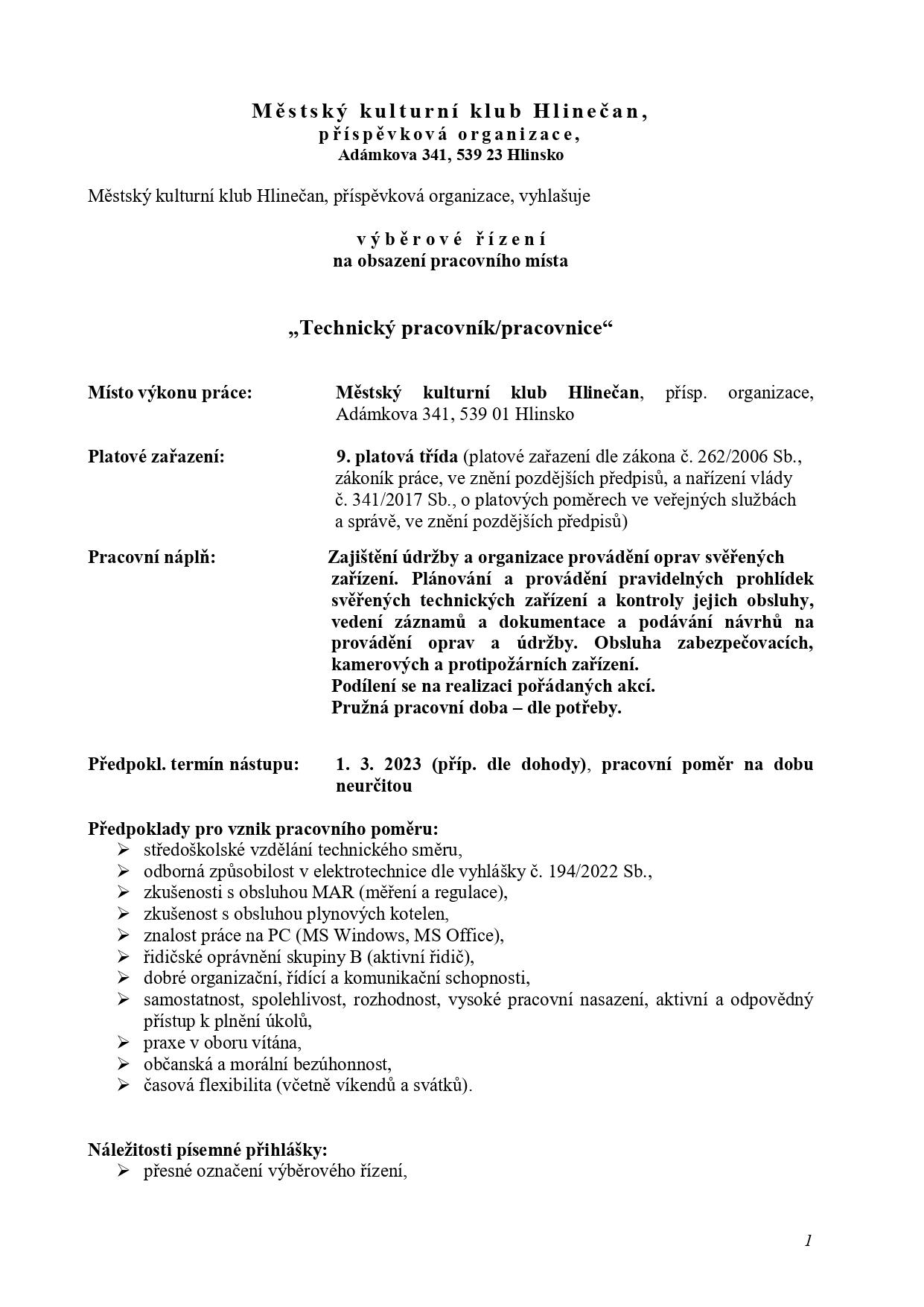 Informace k výběrovému řízení na obsazení pracovního místa "Technický pracovník/pracovnice“ vypsaného Městským kulturním klubem Hlinečan: