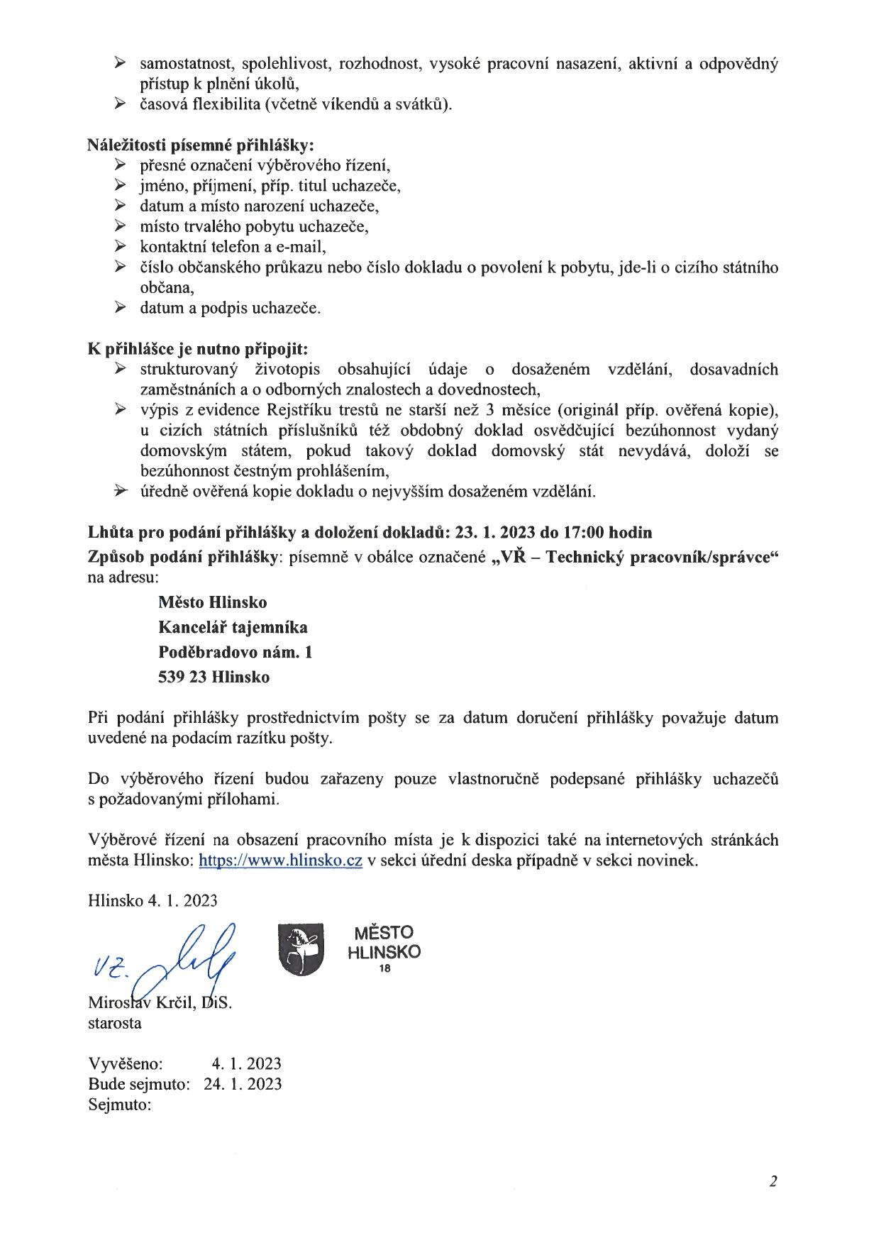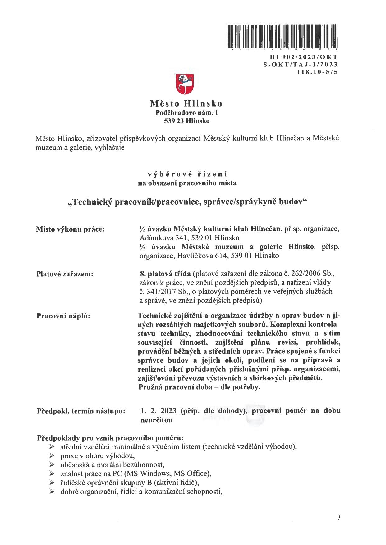 Informace k výběrovému řízení na obsazení pracovního místa "Technický pracovník/pracovnice, správce/správkyně budov“ vypsaného městem Hlinsko: